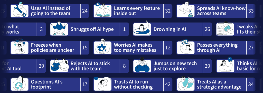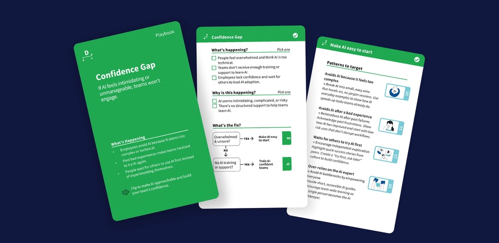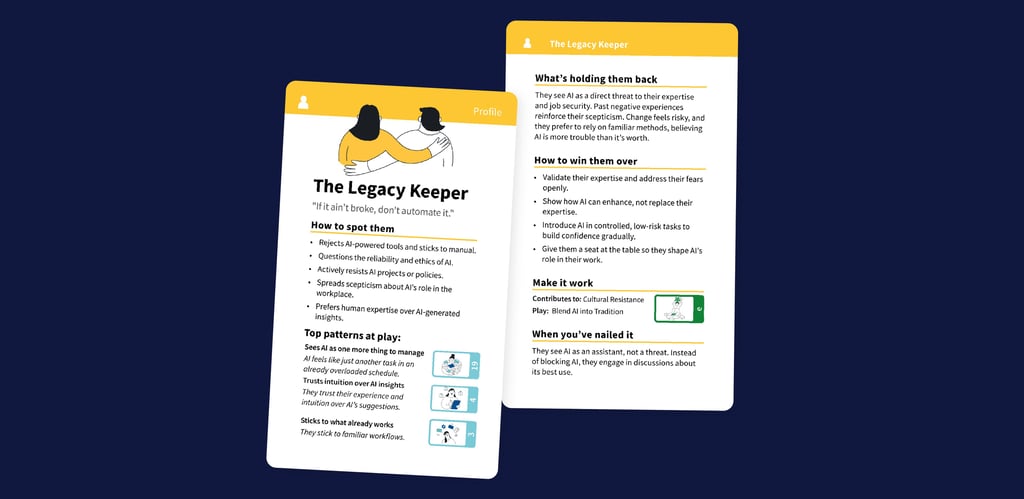 This does two things. First, it gives people language for friction they've felt but couldn't name. "Worries AI makes too many mistakes" or "Uses AI instead of going to the team" become handleable concepts rather than vague frustrations.