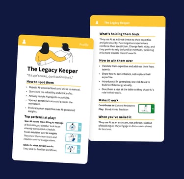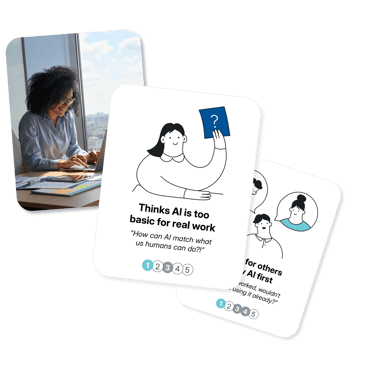Profile cards help facilitators read the room. In any team, you'll have a mix of orientations toward AI. Some people are eager adopters who share what they're learning. Some are excited in theory but rarely use AI in practice. Some are sceptical and need a compelling reason to engage. Some are actively resistant.