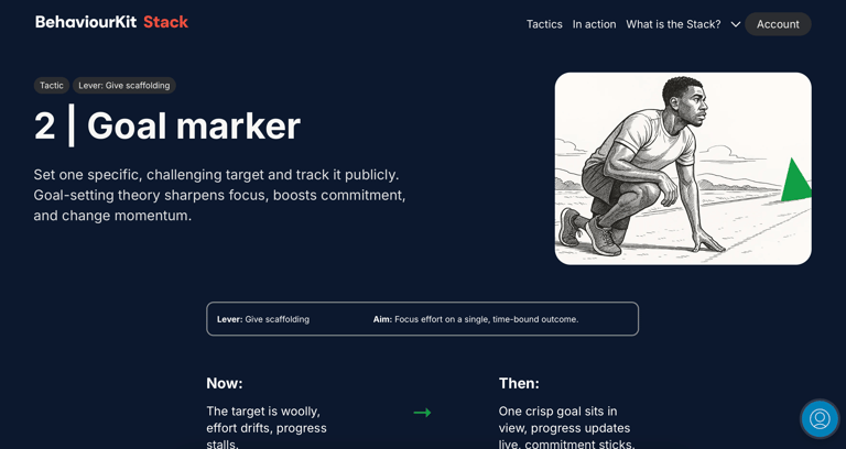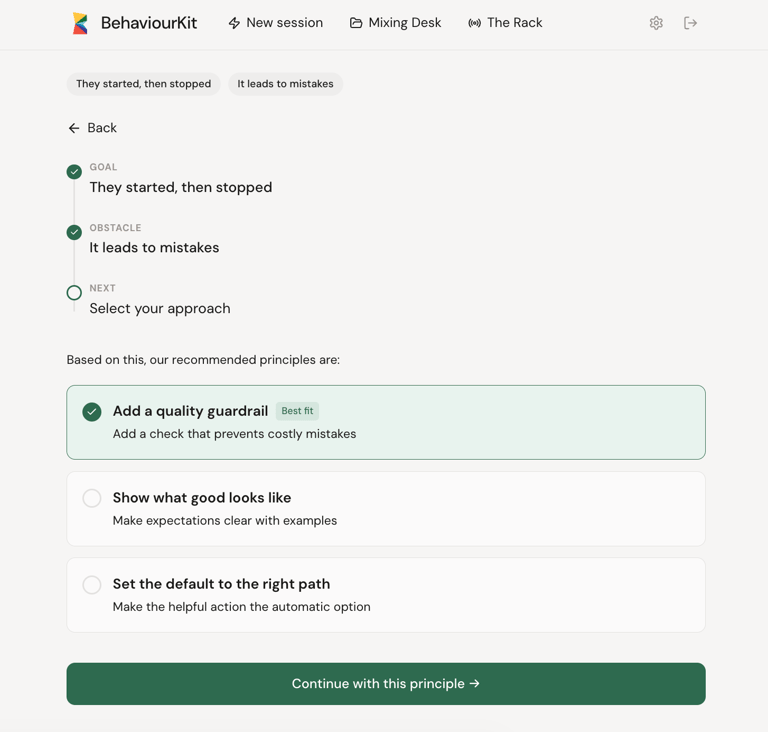 Maintenance mode needs building. Quick Start helps someone take a safe first action. But what happens when that action starts to wobble? When the behaviour fades, gets patchy, or loses quality? The system needs a way to help people adjust, not just start. That's the retention story for the product, and it's the part that acknowledges what practitioners have always known: most behaviour change fails in the middle, not at the start.