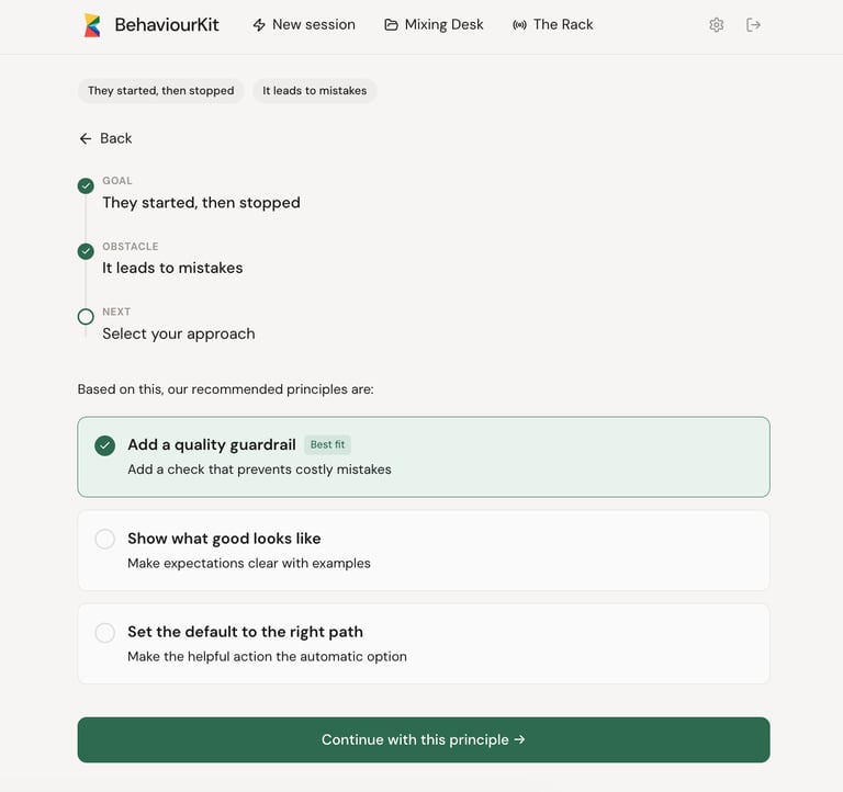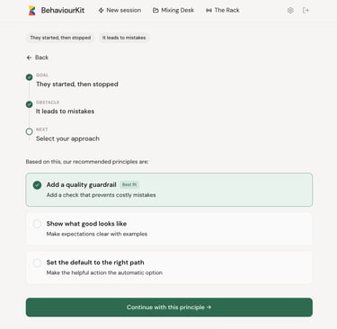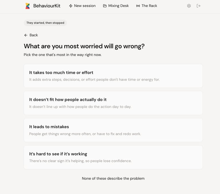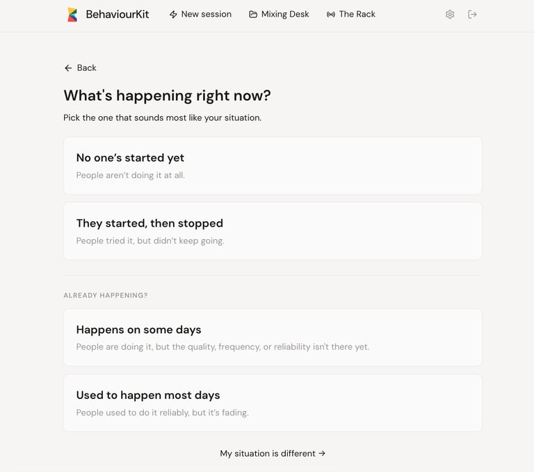 A diagnostic question asks: "What driver is causing this?" That requires expertise. You need to understand what drivers are. You need to assess which one is present and in what state. You need behavioural science vocabulary, or at least a passing familiarity with the framework. That's a high bar for someone who just wants to know what to do about the fact that their change programme is stalling.