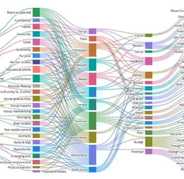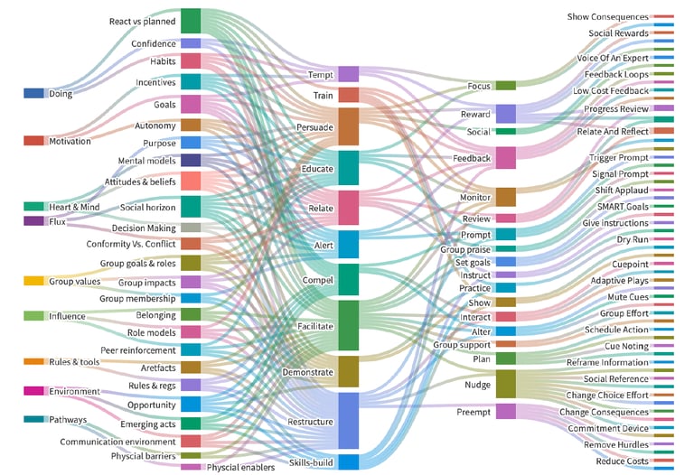 I built an interactive Sankey diagram to visualise the whole system. It's a type of flow chart where the width of each connection shows how dense the route is. You can click on any driver and watch the connections cascade through mechanisms, strategies, tactics, and patterns. The result is, honestly, quite beautiful. Nine drivers fanning through 26 mechanisms, through eleven strategies, through various tactics, arriving at around 56 named patterns. Some routes are wide and well-trodden. Others are narrow threads.