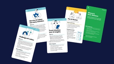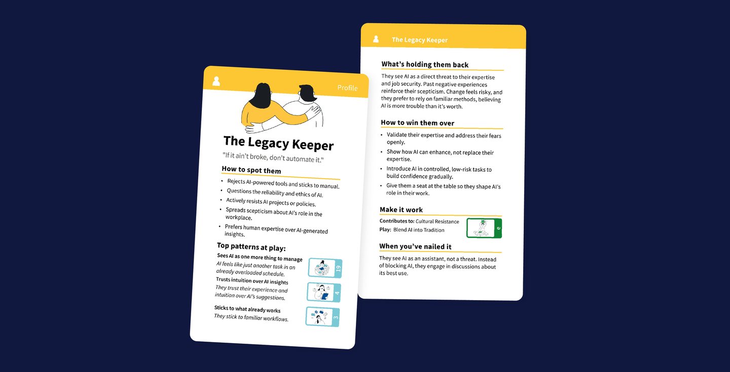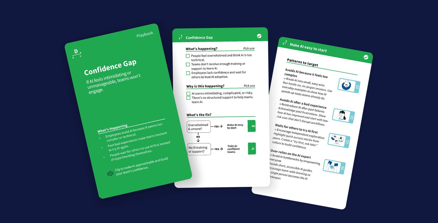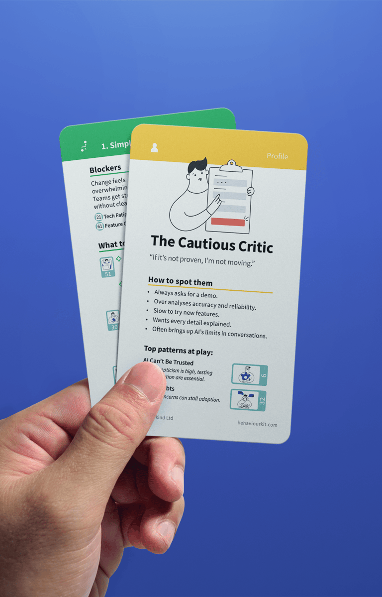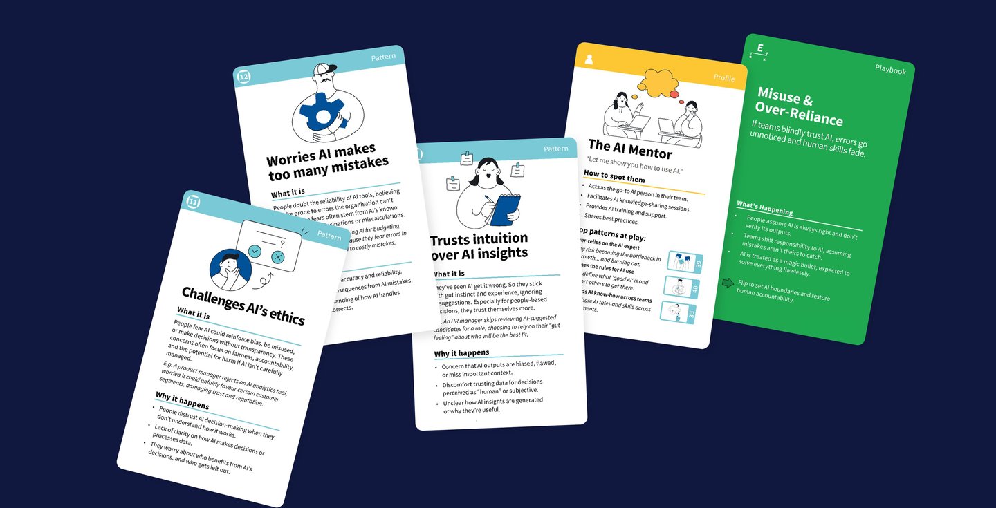 Pattern cards describe what teams can actually see happening, and what it tends to cost. Profile cards help facilitators recognise different mindsets in the room, so the response isn’t one-size-fits-all. Playbook cards give step-by-step interventions that fit into existing meetings.